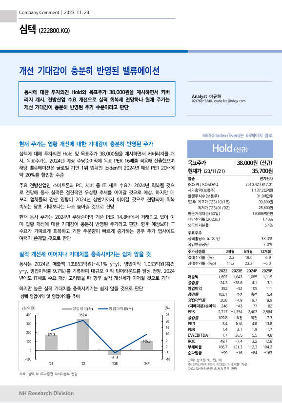 개선 기대감이 충분히 반영된 밸류에이션 - NH증권